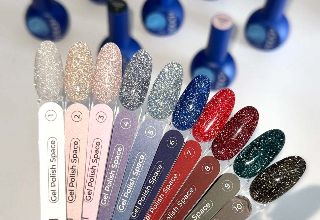 SPACE Gel Polish – kolekcija 10 reflektivnih (flash) odtenkov, ki navdušujejo tako na dnevni svetlobi kot pod umetno ali nočno osvetlitvijo.